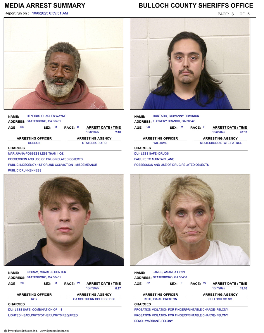 These records are matters of public information provided by the Bulloch County Sheriff’s Office. Booking reports are details of arrests only. All persons below are considered to be innocent unless proven otherwise in a court of law.