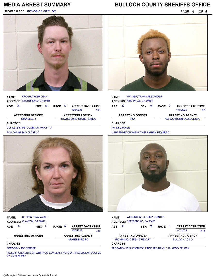 These records are matters of public information provided by the Bulloch County Sheriff’s Office. Booking reports are details of arrests only. All persons below are considered to be innocent unless proven otherwise in a court of law.