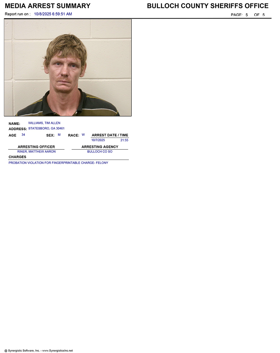 These records are matters of public information provided by the Bulloch County Sheriff’s Office. Booking reports are details of arrests only. All persons below are considered to be innocent unless proven otherwise in a court of law.