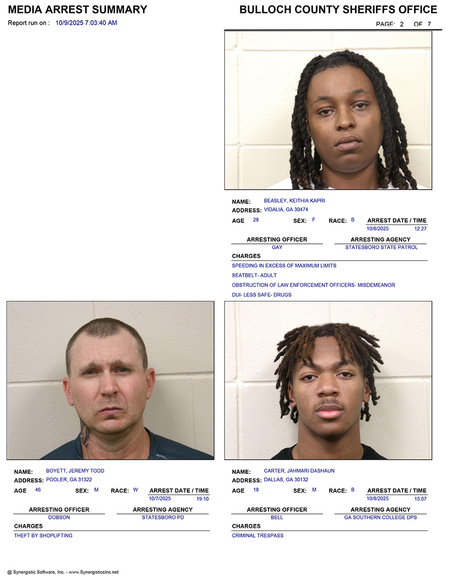 These records are matters of public information provided by the Bulloch County Sheriff’s Office. Booking reports are details of arrests only. All persons below are considered to be innocent unless proven otherwise in a court of law.
