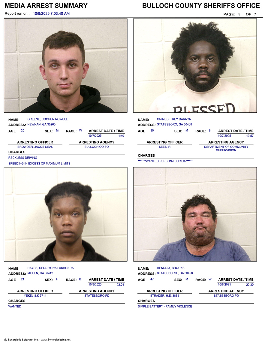 These records are matters of public information provided by the Bulloch County Sheriff’s Office. Booking reports are details of arrests only. All persons below are considered to be innocent unless proven otherwise in a court of law.