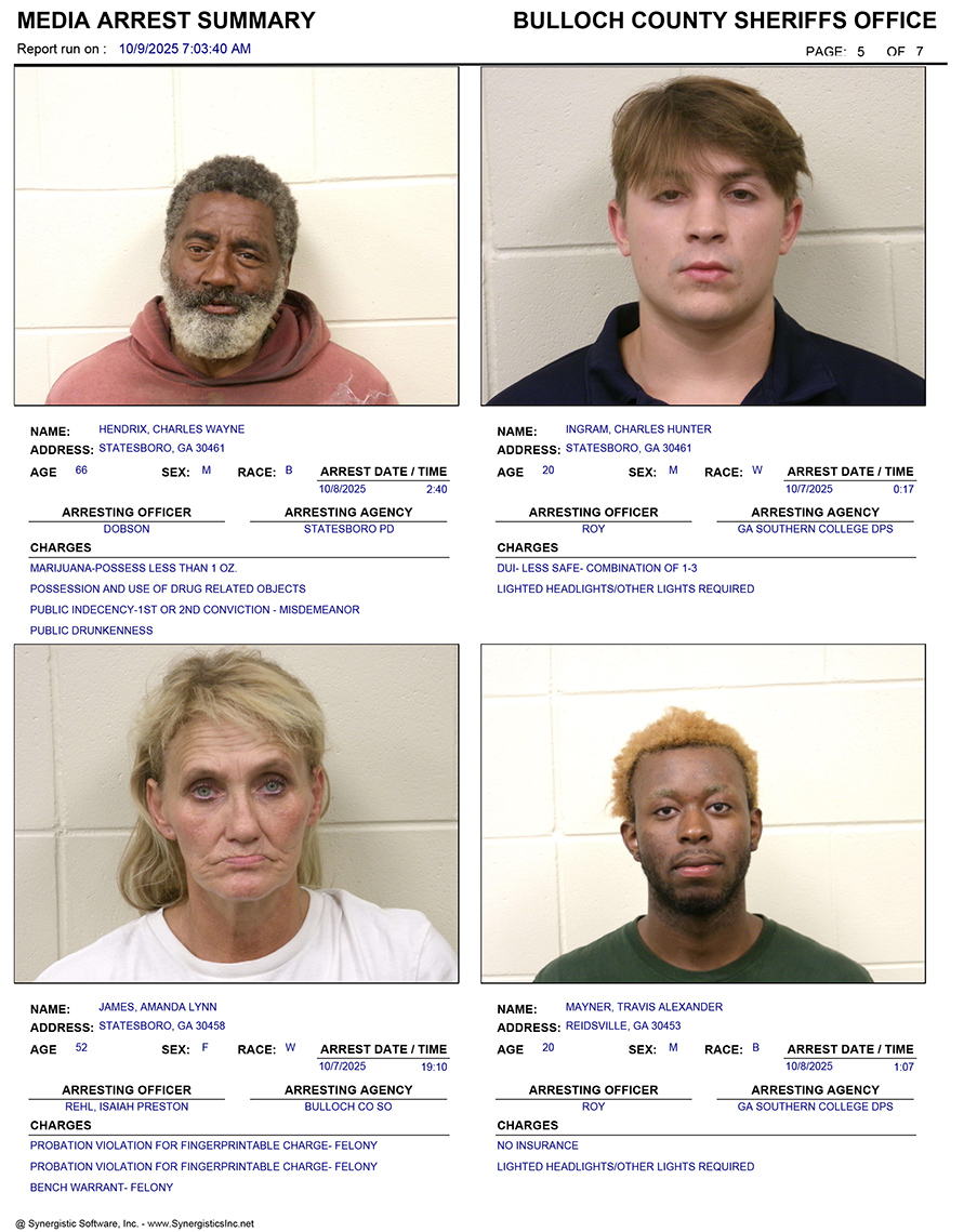 These records are matters of public information provided by the Bulloch County Sheriff’s Office. Booking reports are details of arrests only. All persons below are considered to be innocent unless proven otherwise in a court of law.
