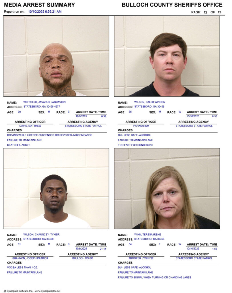 These records are matters of public information provided by the Bulloch County Sheriff’s Office. Booking reports are details of arrests only. All persons below are considered to be innocent unless proven otherwise in a court of law.