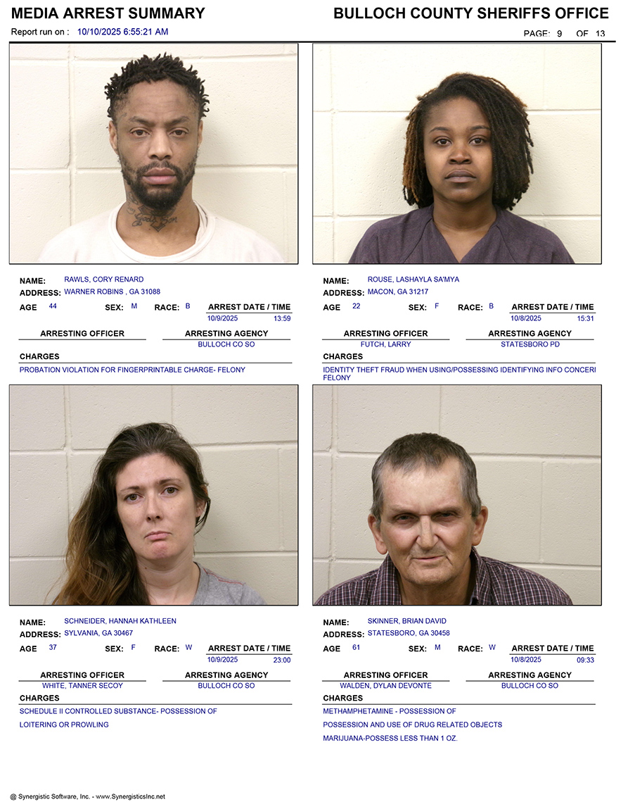 These records are matters of public information provided by the Bulloch County Sheriff’s Office. Booking reports are details of arrests only. All persons below are considered to be innocent unless proven otherwise in a court of law.