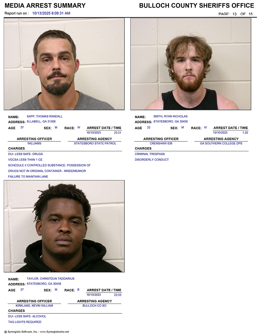 These records are matters of public information provided by the Bulloch County Sheriff’s Office. Booking reports are details of arrests only. All persons below are considered to be innocent unless proven otherwise in a court of law.