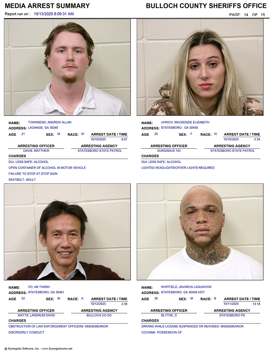These records are matters of public information provided by the Bulloch County Sheriff’s Office. Booking reports are details of arrests only. All persons below are considered to be innocent unless proven otherwise in a court of law.