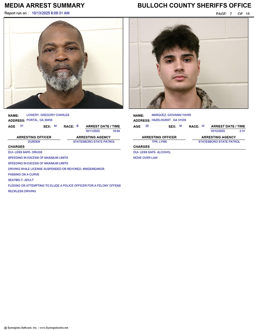 These records are matters of public information provided by the Bulloch County Sheriff’s Office. Booking reports are details of arrests only. All persons below are considered to be innocent unless proven otherwise in a court of law.