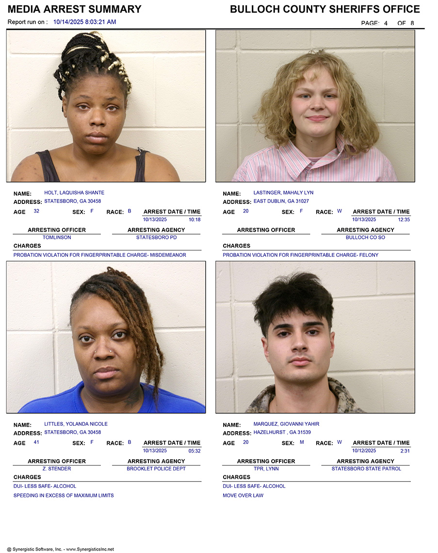 These records are matters of public information provided by the Bulloch County Sheriff’s Office. Booking reports are details of arrests only. All persons below are considered to be innocent unless proven otherwise in a court of law.