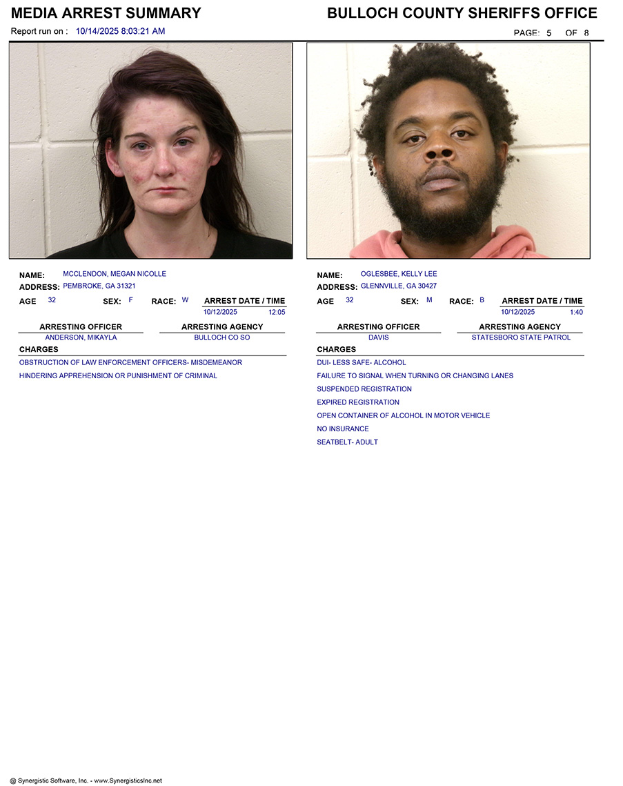 These records are matters of public information provided by the Bulloch County Sheriff’s Office. Booking reports are details of arrests only. All persons below are considered to be innocent unless proven otherwise in a court of law.