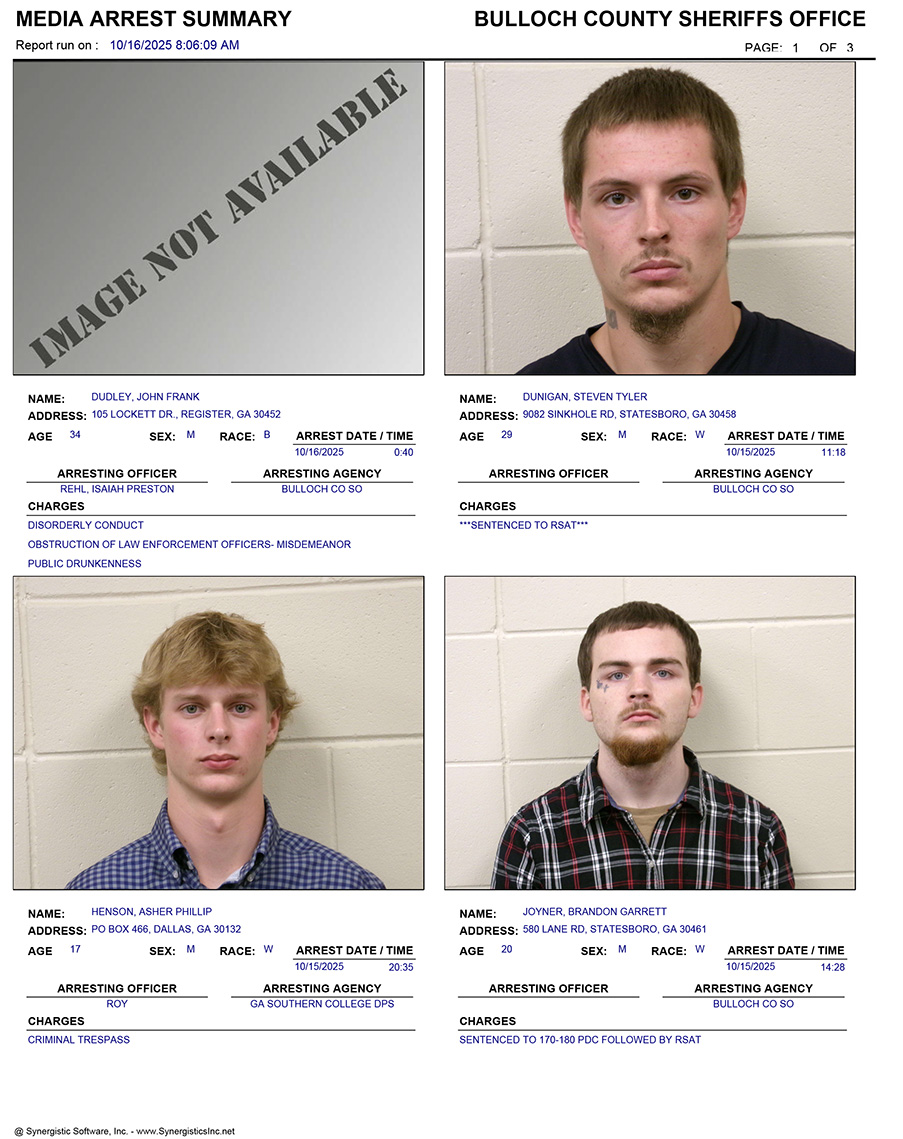 These records are matters of public information provided by the Bulloch County Sheriff’s Office. Booking reports are details of arrests only. All persons below are considered to be innocent unless proven otherwise in a court of law.