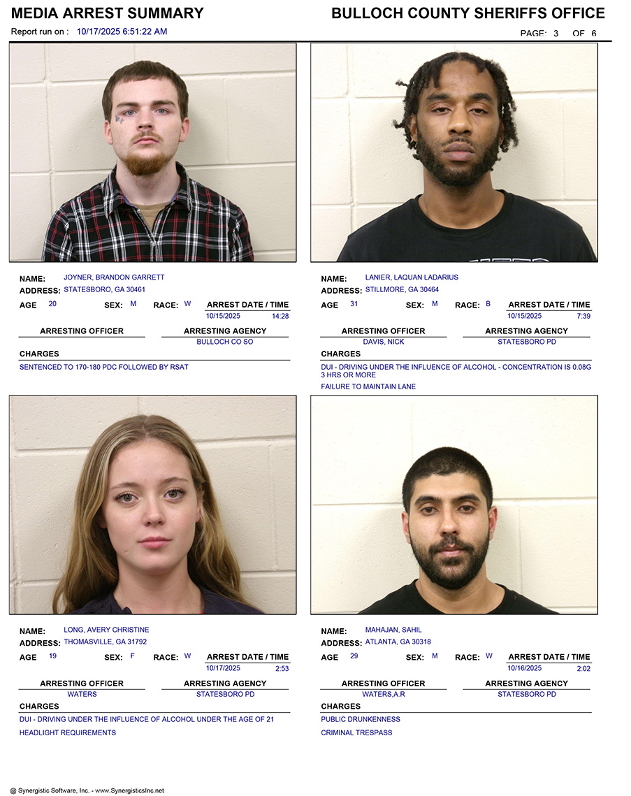These records are matters of public information provided by the Bulloch County Sheriff’s Office. Booking reports are details of arrests only. All persons below are considered to be innocent unless proven otherwise in a court of law.