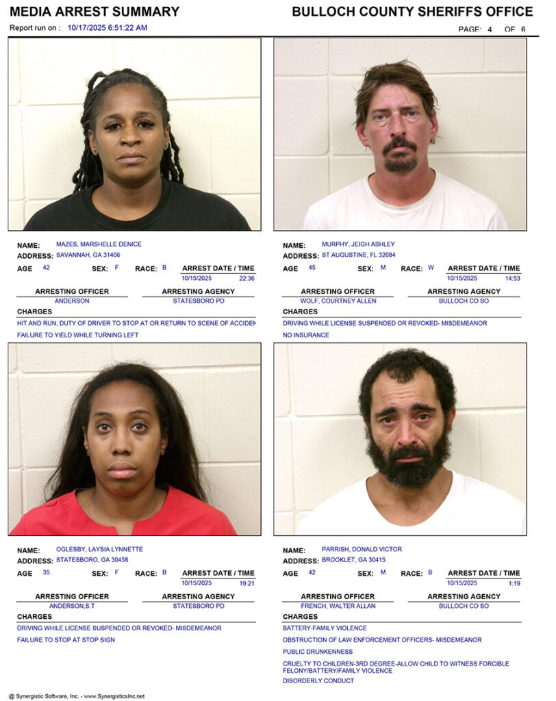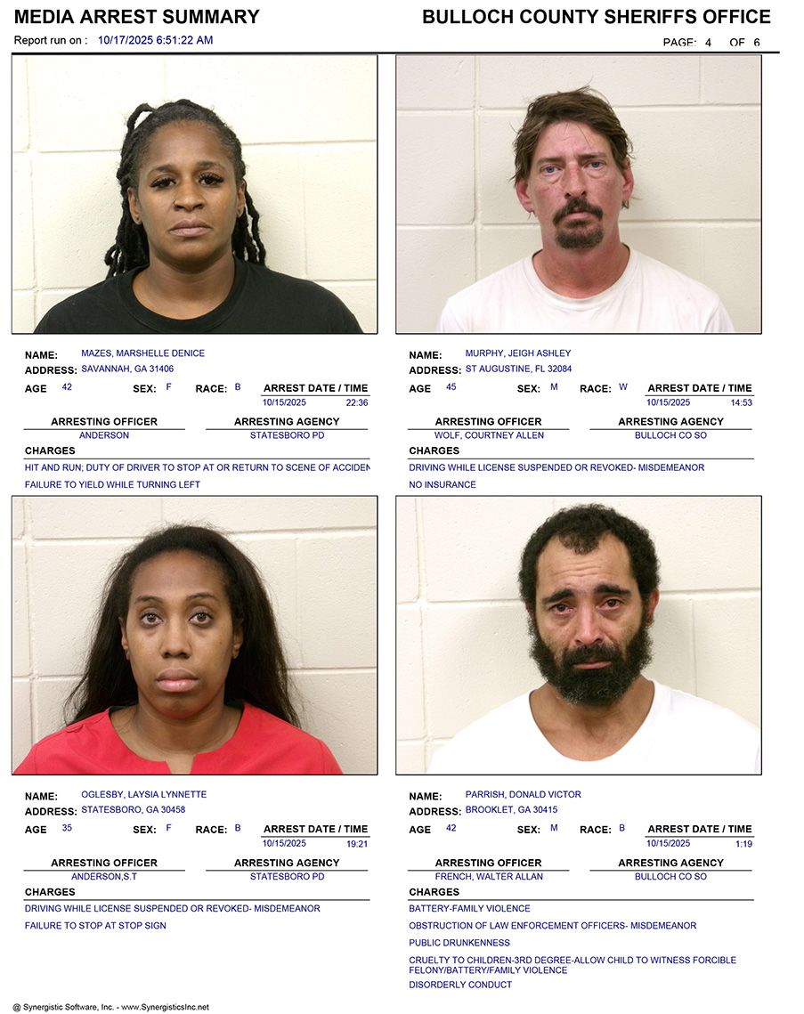 These records are matters of public information provided by the Bulloch County Sheriff’s Office. Booking reports are details of arrests only. All persons below are considered to be innocent unless proven otherwise in a court of law.