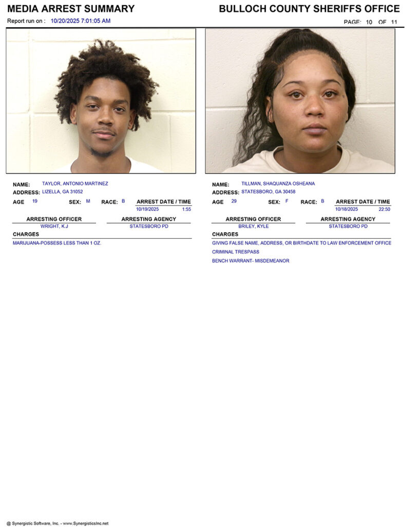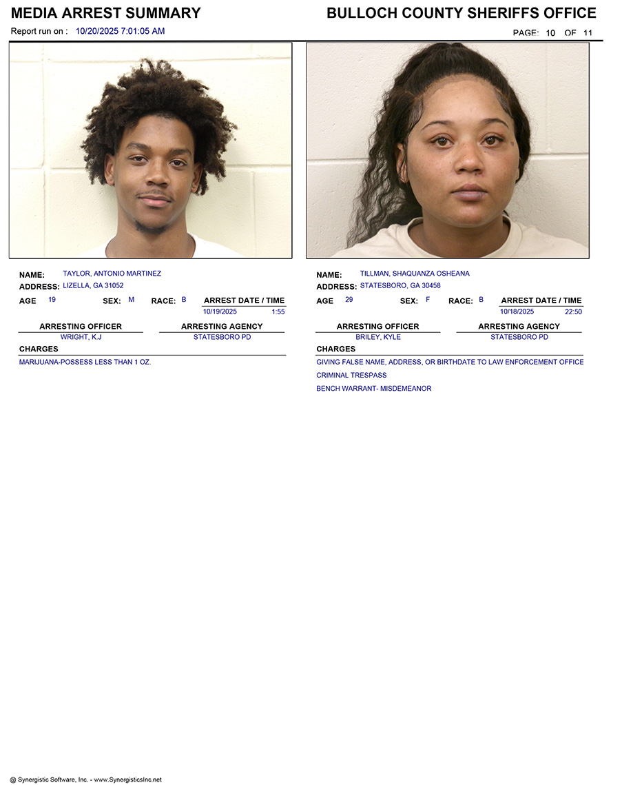 These records are matters of public information provided by the Bulloch County Sheriff’s Office. Booking reports are details of arrests only. All persons below are considered to be innocent unless proven otherwise in a court of law.