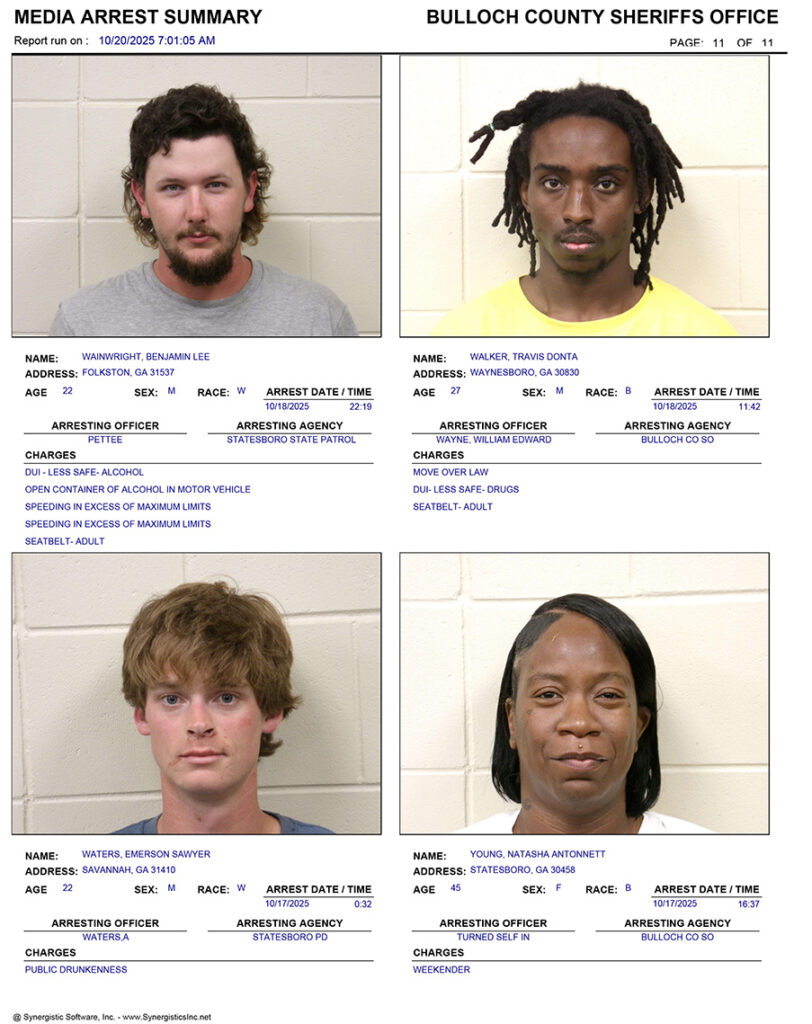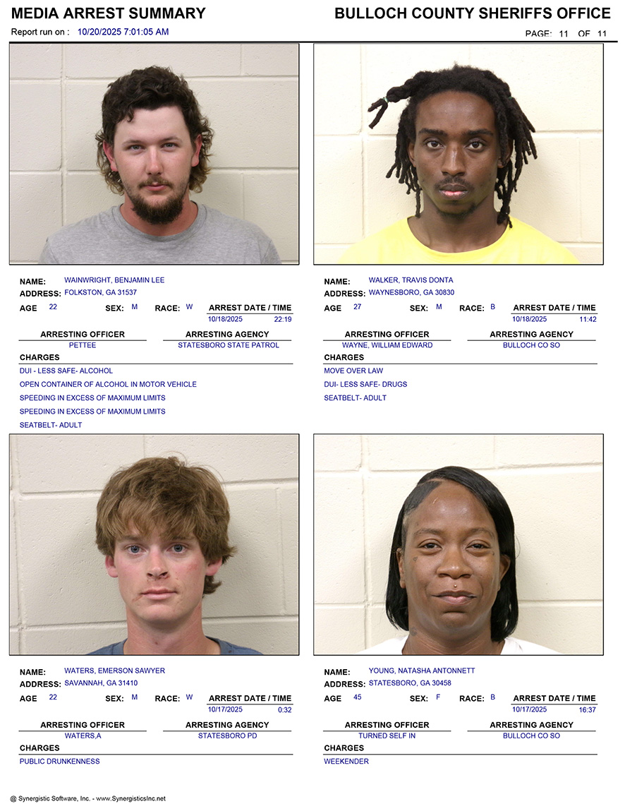 These records are matters of public information provided by the Bulloch County Sheriff’s Office. Booking reports are details of arrests only. All persons below are considered to be innocent unless proven otherwise in a court of law.