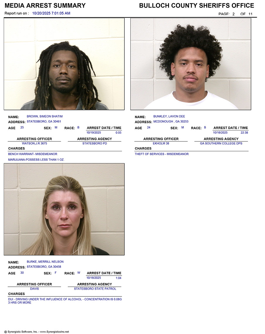 These records are matters of public information provided by the Bulloch County Sheriff’s Office. Booking reports are details of arrests only. All persons below are considered to be innocent unless proven otherwise in a court of law.