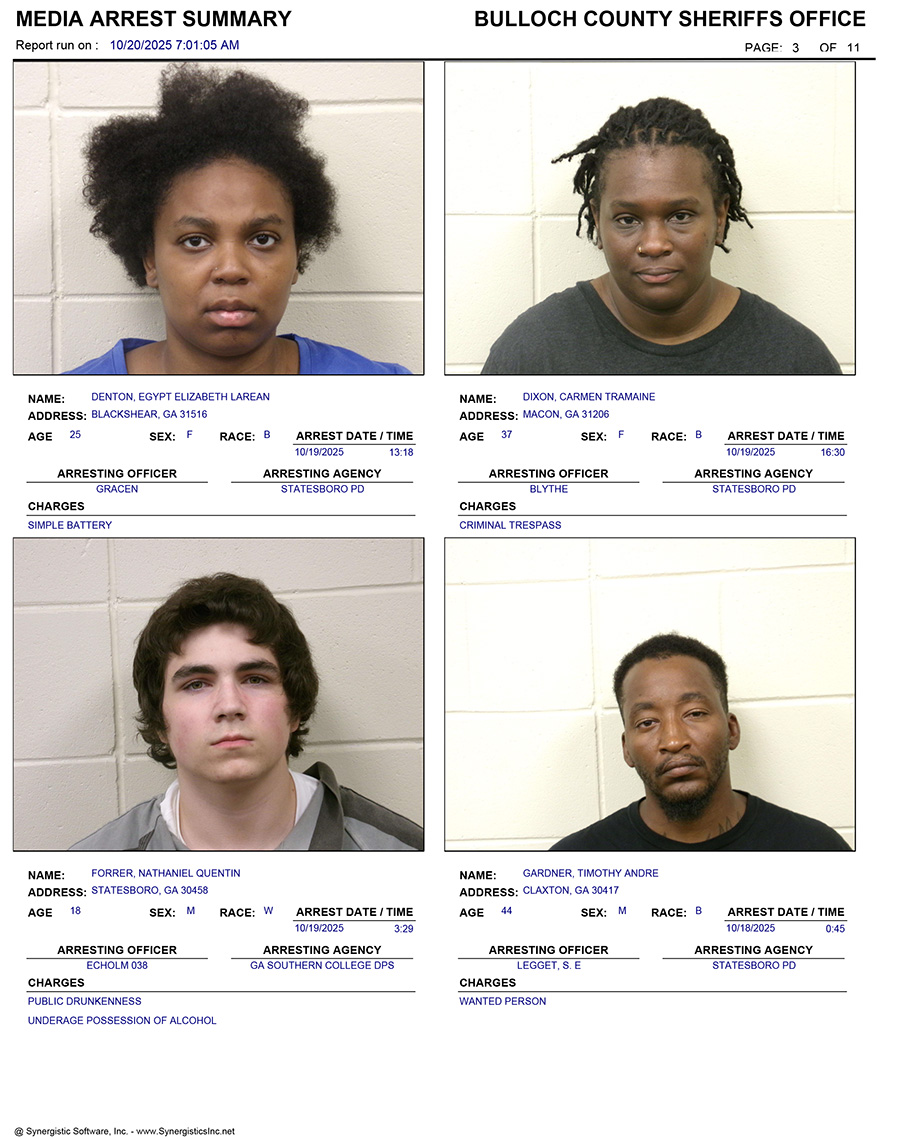 These records are matters of public information provided by the Bulloch County Sheriff’s Office. Booking reports are details of arrests only. All persons below are considered to be innocent unless proven otherwise in a court of law.
