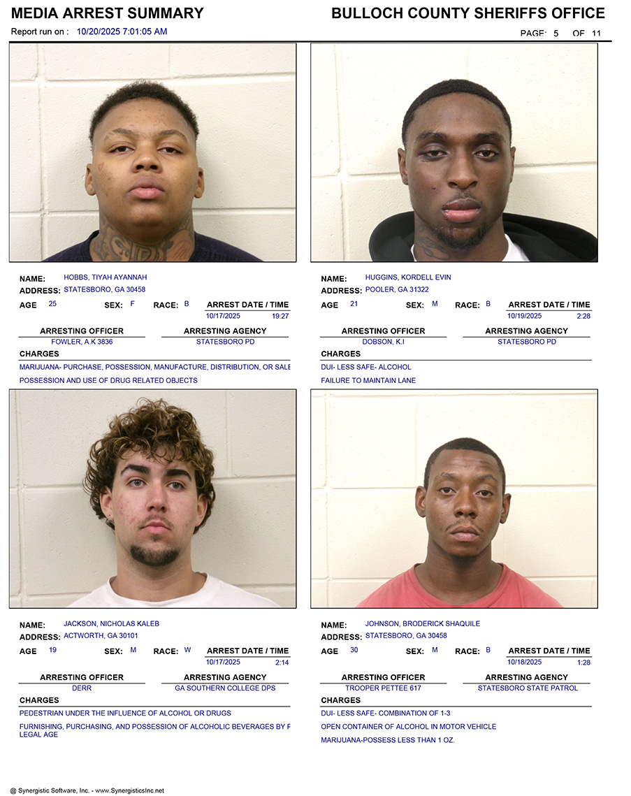 These records are matters of public information provided by the Bulloch County Sheriff’s Office. Booking reports are details of arrests only. All persons below are considered to be innocent unless proven otherwise in a court of law.