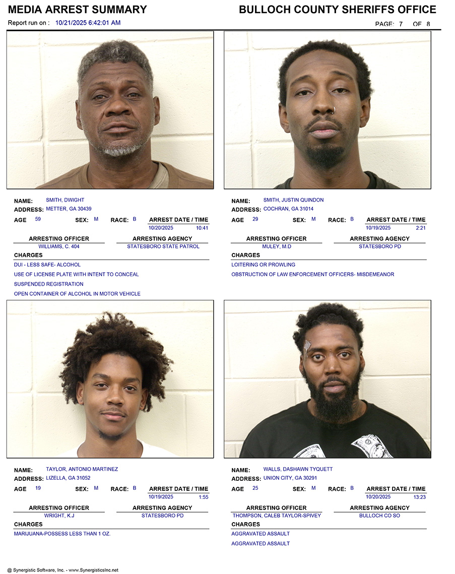 These records are matters of public information provided by the Bulloch County Sheriff’s Office. Booking reports are details of arrests only. All persons below are considered to be innocent unless proven otherwise in a court of law.
