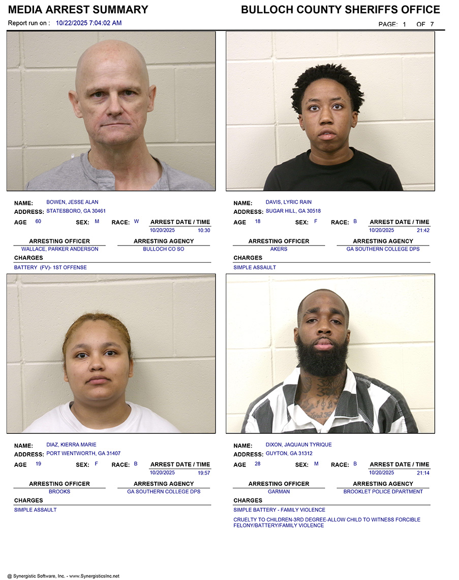 These records are matters of public information provided by the Bulloch County Sheriff’s Office. Booking reports are details of arrests only. All persons below are considered to be innocent unless proven otherwise in a court of law.