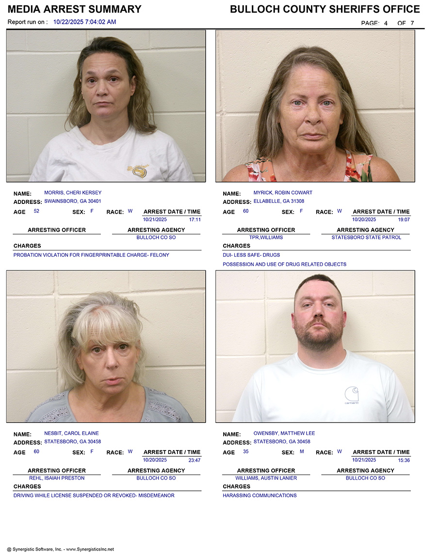 These records are matters of public information provided by the Bulloch County Sheriff’s Office. Booking reports are details of arrests only. All persons below are considered to be innocent unless proven otherwise in a court of law.
