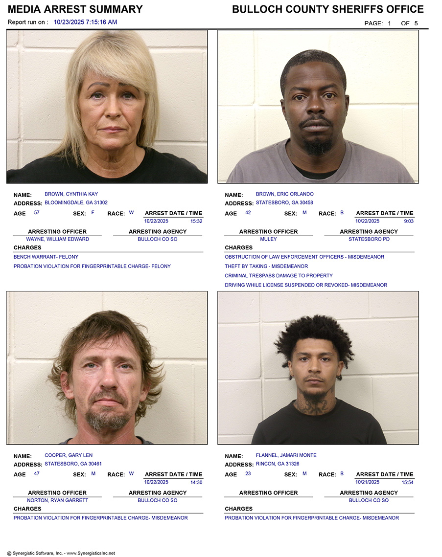 These records are matters of public information provided by the Bulloch County Sheriff’s Office. Booking reports are details of arrests only. All persons below are considered to be innocent unless proven otherwise in a court of law.