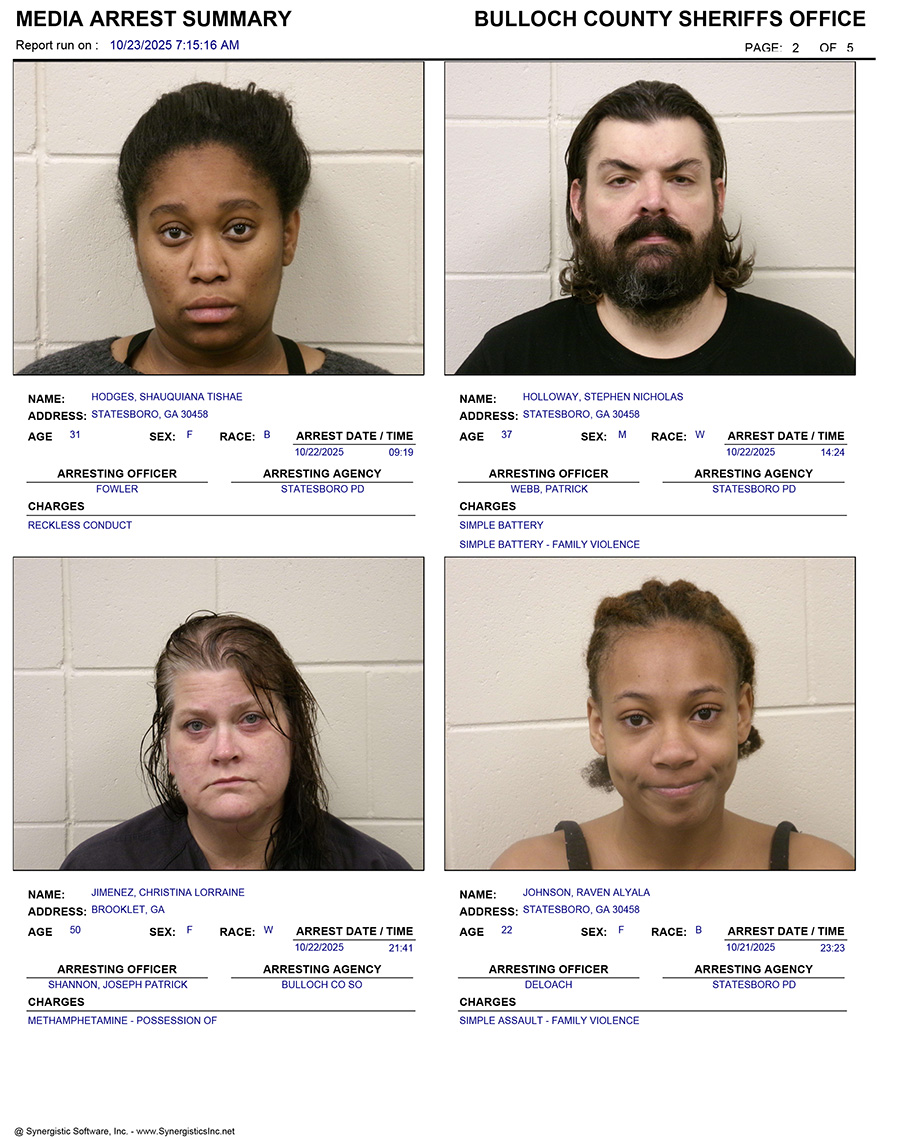 These records are matters of public information provided by the Bulloch County Sheriff’s Office. Booking reports are details of arrests only. All persons below are considered to be innocent unless proven otherwise in a court of law.