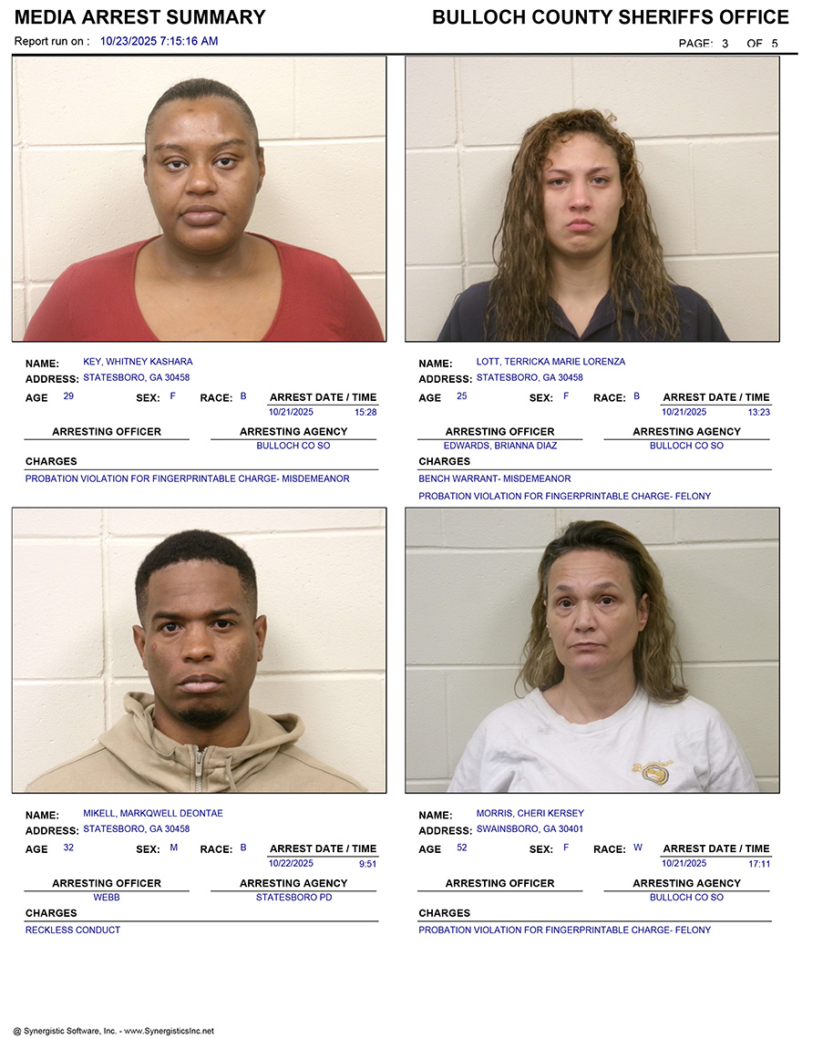 These records are matters of public information provided by the Bulloch County Sheriff’s Office. Booking reports are details of arrests only. All persons below are considered to be innocent unless proven otherwise in a court of law.
