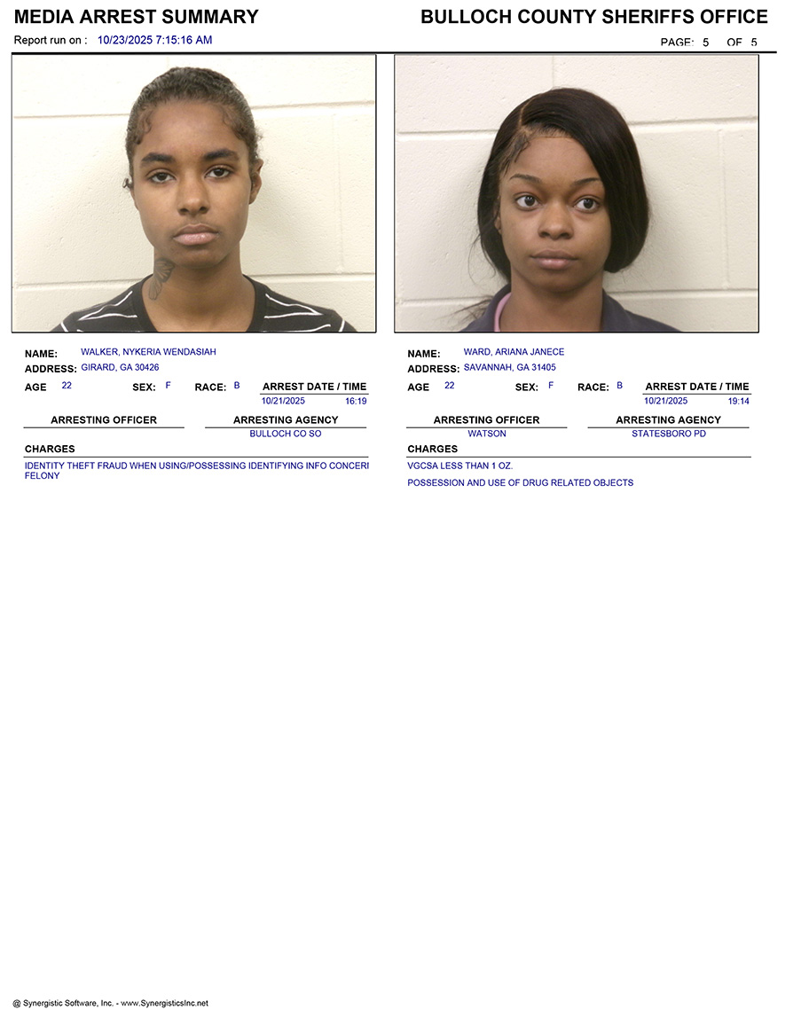 These records are matters of public information provided by the Bulloch County Sheriff’s Office. Booking reports are details of arrests only. All persons below are considered to be innocent unless proven otherwise in a court of law.