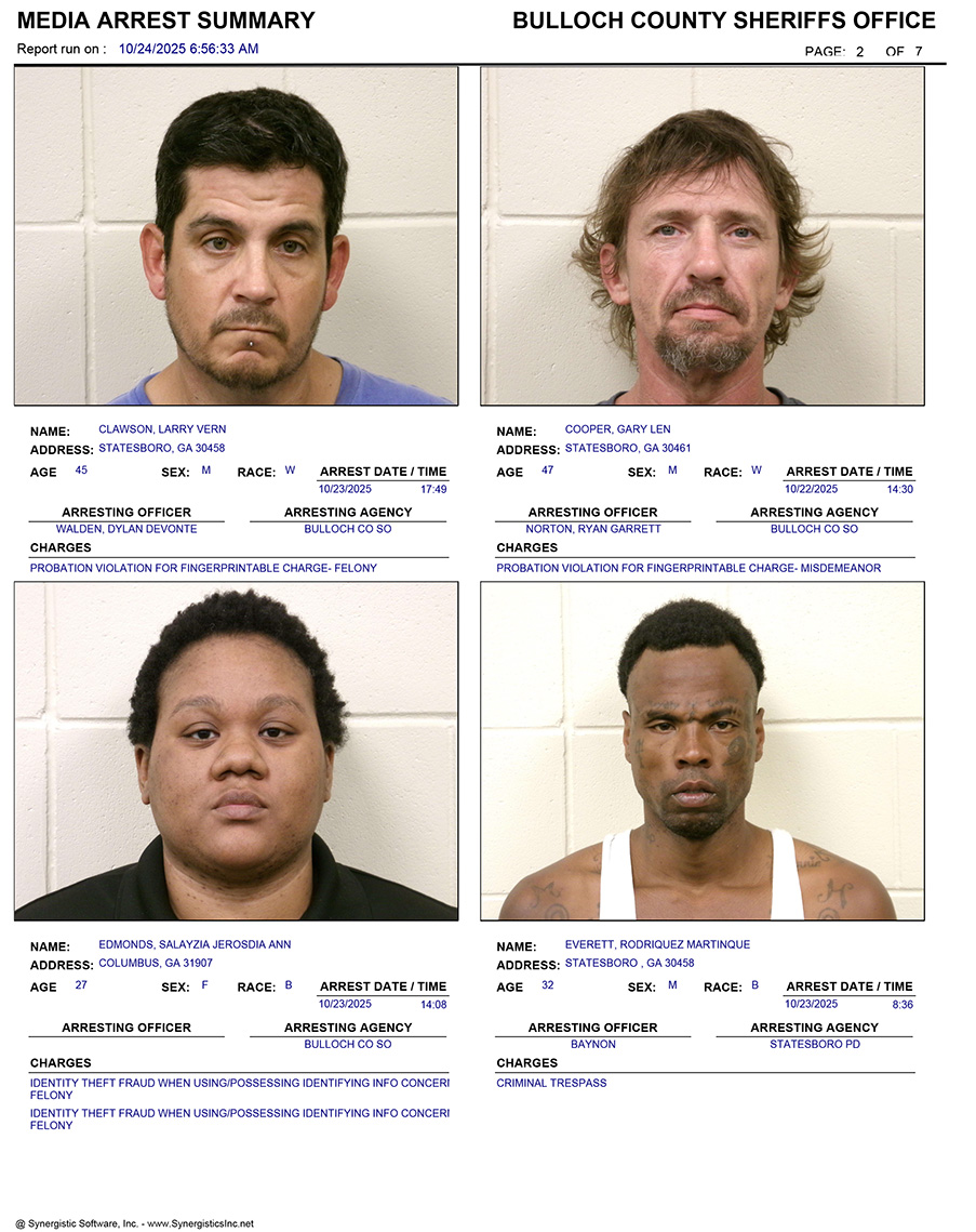 These records are matters of public information provided by the Bulloch County Sheriff’s Office. Booking reports are details of arrests only. All persons below are considered to be innocent unless proven otherwise in a court of law.