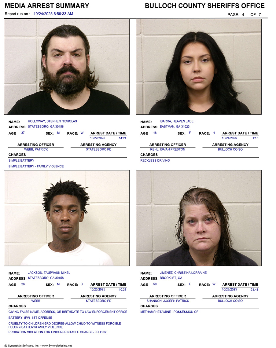 These records are matters of public information provided by the Bulloch County Sheriff’s Office. Booking reports are details of arrests only. All persons below are considered to be innocent unless proven otherwise in a court of law.