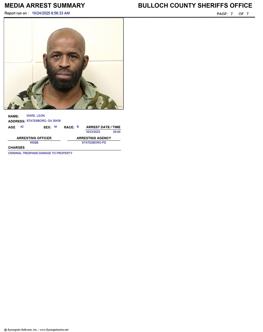 These records are matters of public information provided by the Bulloch County Sheriff’s Office. Booking reports are details of arrests only. All persons below are considered to be innocent unless proven otherwise in a court of law.