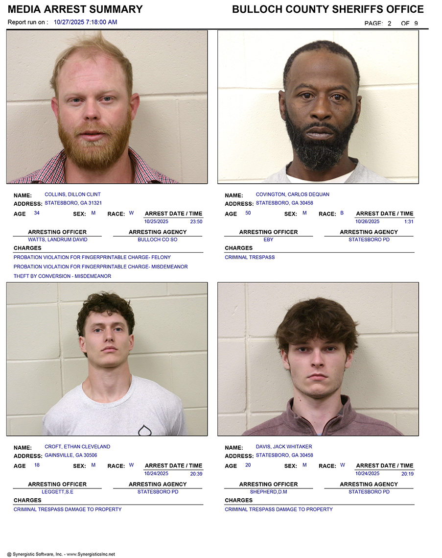 These records are matters of public information provided by the Bulloch County Sheriff’s Office. Booking reports are details of arrests only. All persons below are considered to be innocent unless proven otherwise in a court of law.