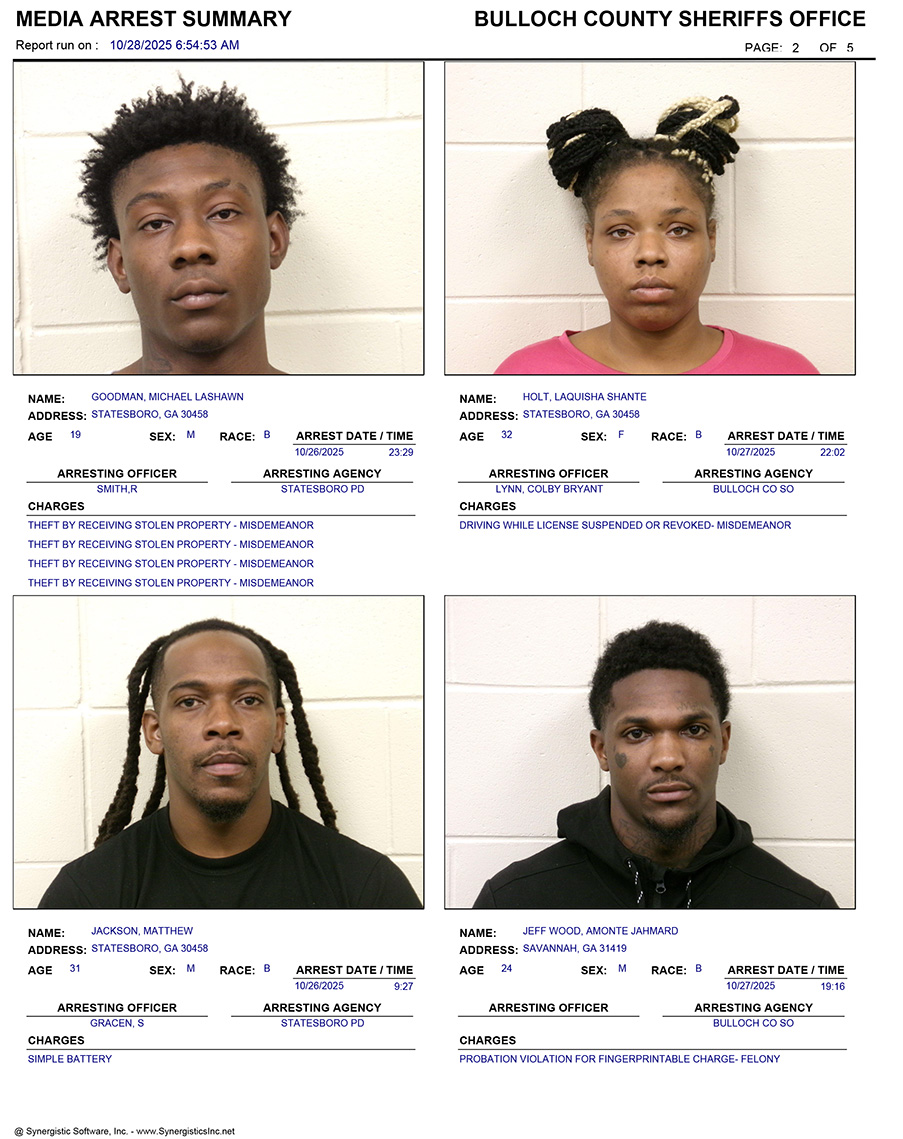 These records are matters of public information provided by the Bulloch County Sheriff’s Office. Booking reports are details of arrests only. All persons below are considered to be innocent unless proven otherwise in a court of law.