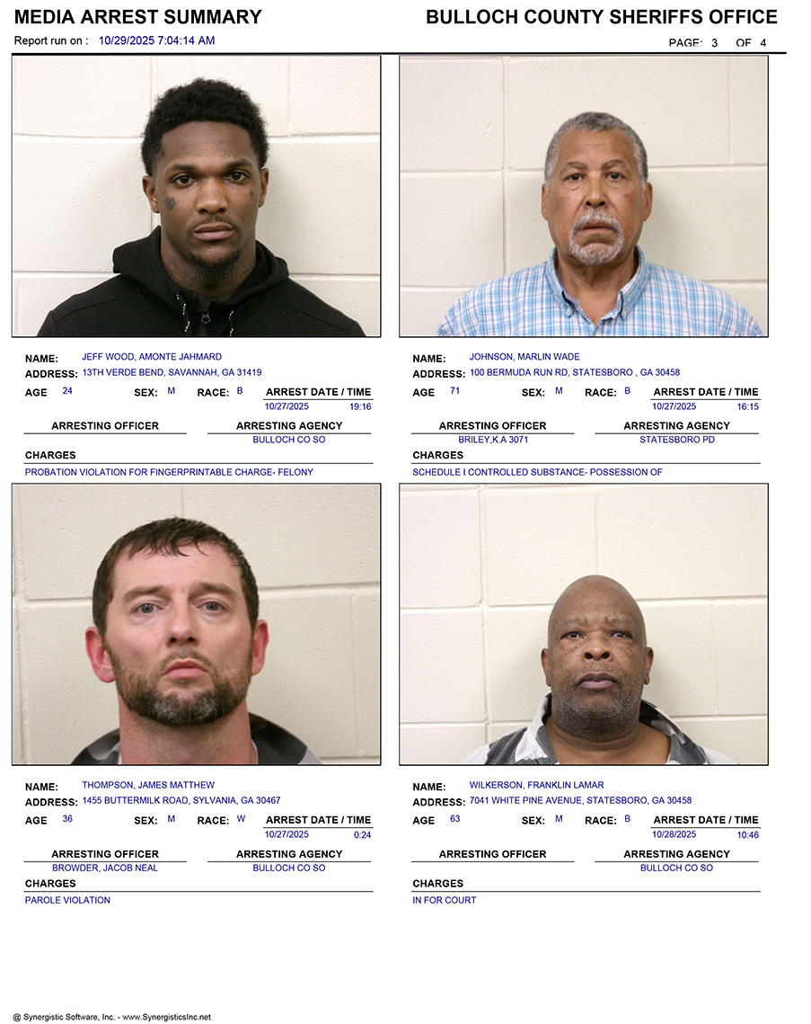 These records are matters of public information provided by the Bulloch County Sheriff’s Office. Booking reports are details of arrests only. All persons below are considered to be innocent unless proven otherwise in a court of law.