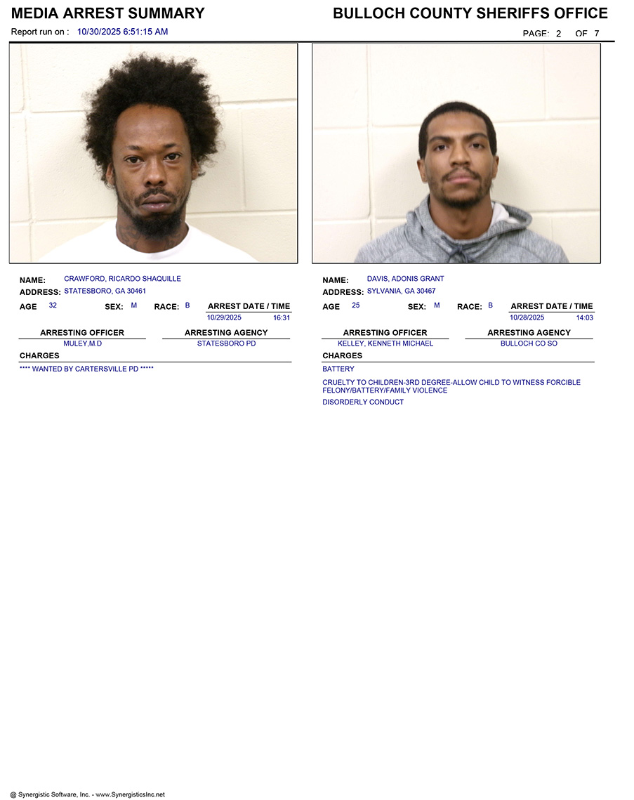 These records are matters of public information provided by the Bulloch County Sheriff’s Office. Booking reports are details of arrests only. All persons below are considered to be innocent unless proven otherwise in a court of law.