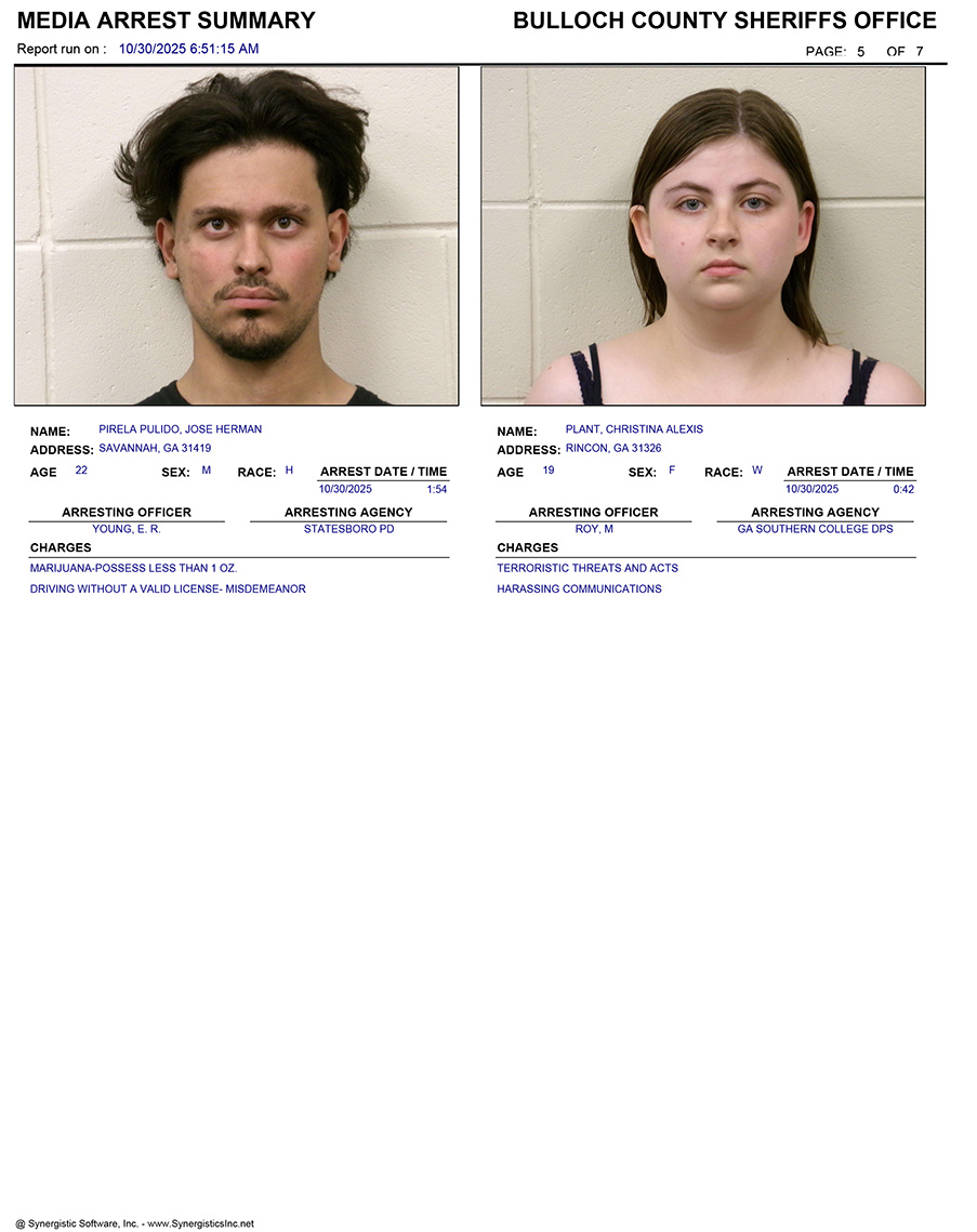 These records are matters of public information provided by the Bulloch County Sheriff’s Office. Booking reports are details of arrests only. All persons below are considered to be innocent unless proven otherwise in a court of law.