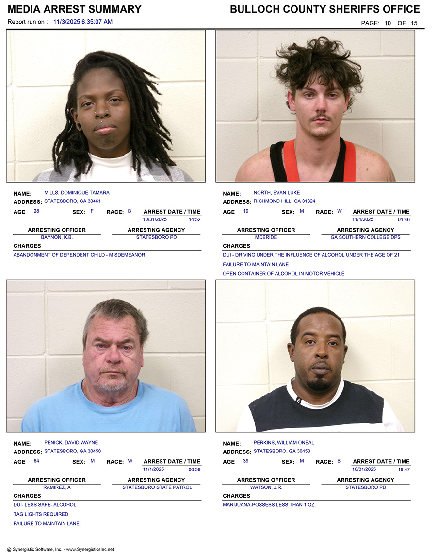 These records are matters of public information provided by the Bulloch County Sheriff’s Office. Booking reports are details of arrests only. All persons below are considered to be innocent unless proven otherwise in a court of law.