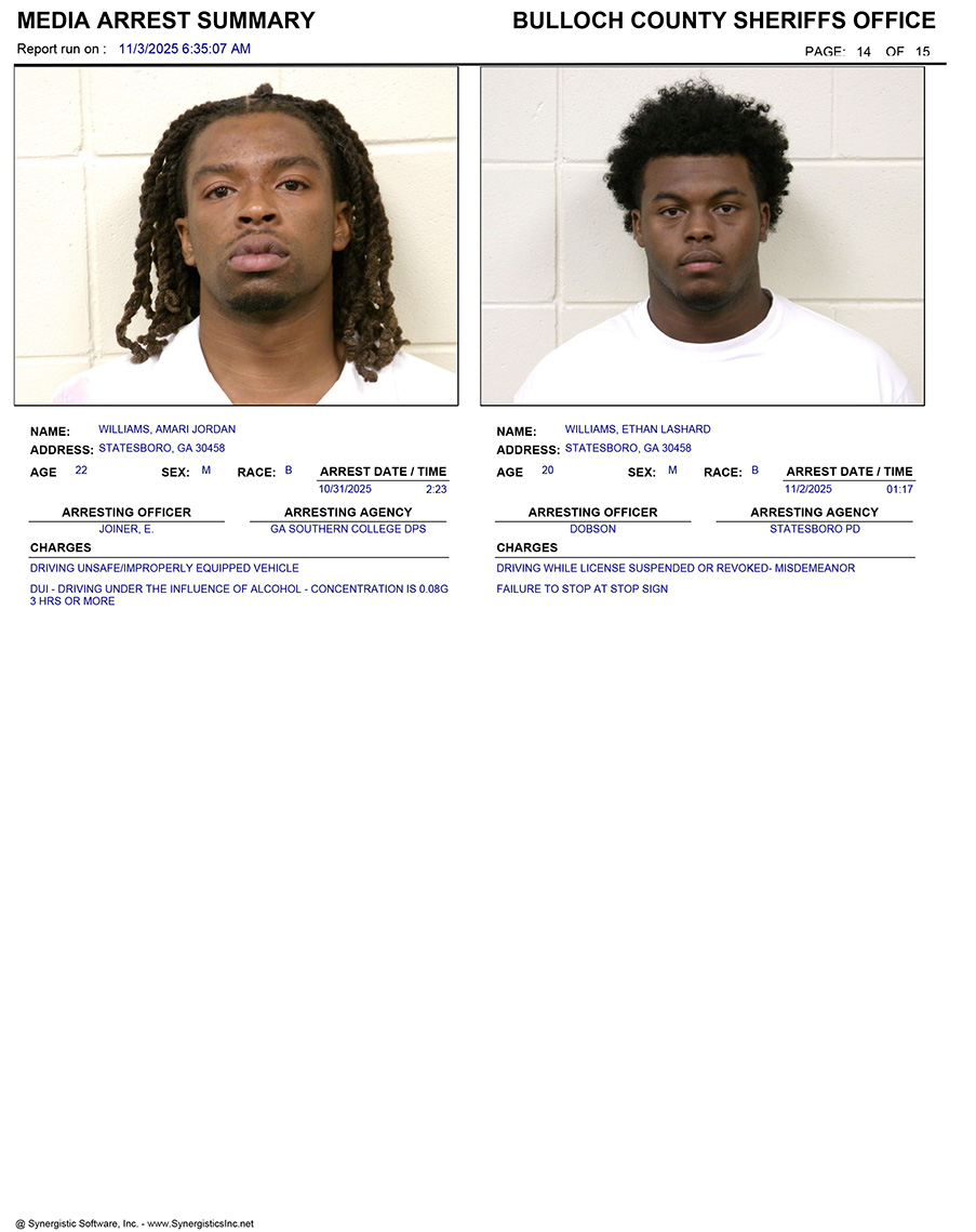 These records are matters of public information provided by the Bulloch County Sheriff’s Office. Booking reports are details of arrests only. All persons below are considered to be innocent unless proven otherwise in a court of law.