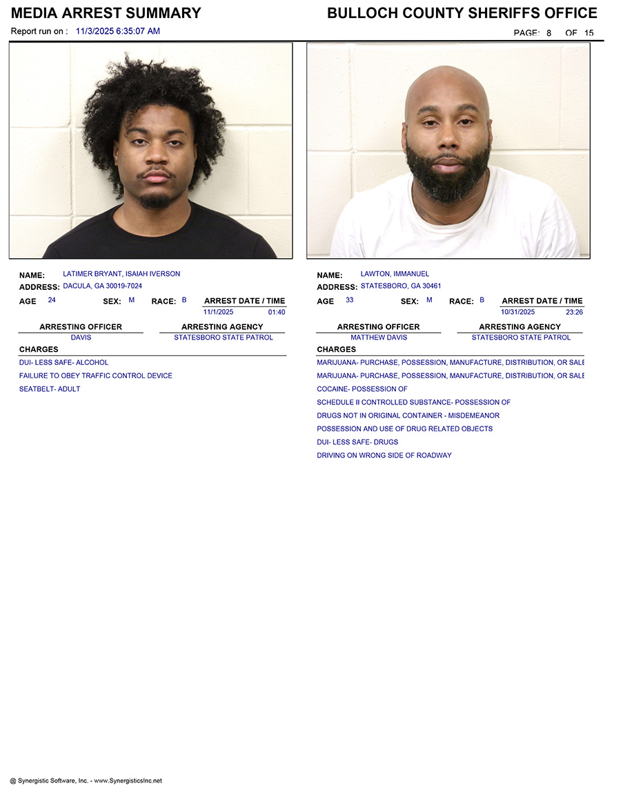 These records are matters of public information provided by the Bulloch County Sheriff’s Office. Booking reports are details of arrests only. All persons below are considered to be innocent unless proven otherwise in a court of law.