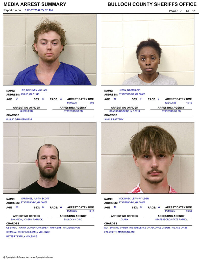 These records are matters of public information provided by the Bulloch County Sheriff’s Office. Booking reports are details of arrests only. All persons below are considered to be innocent unless proven otherwise in a court of law.