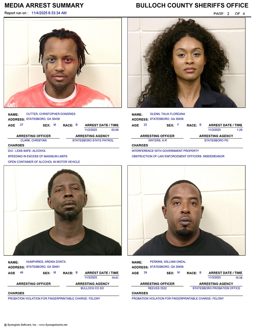 These records are matters of public information provided by the Bulloch County Sheriff’s Office. Booking reports are details of arrests only. All persons below are considered to be innocent unless proven otherwise in a court of law.