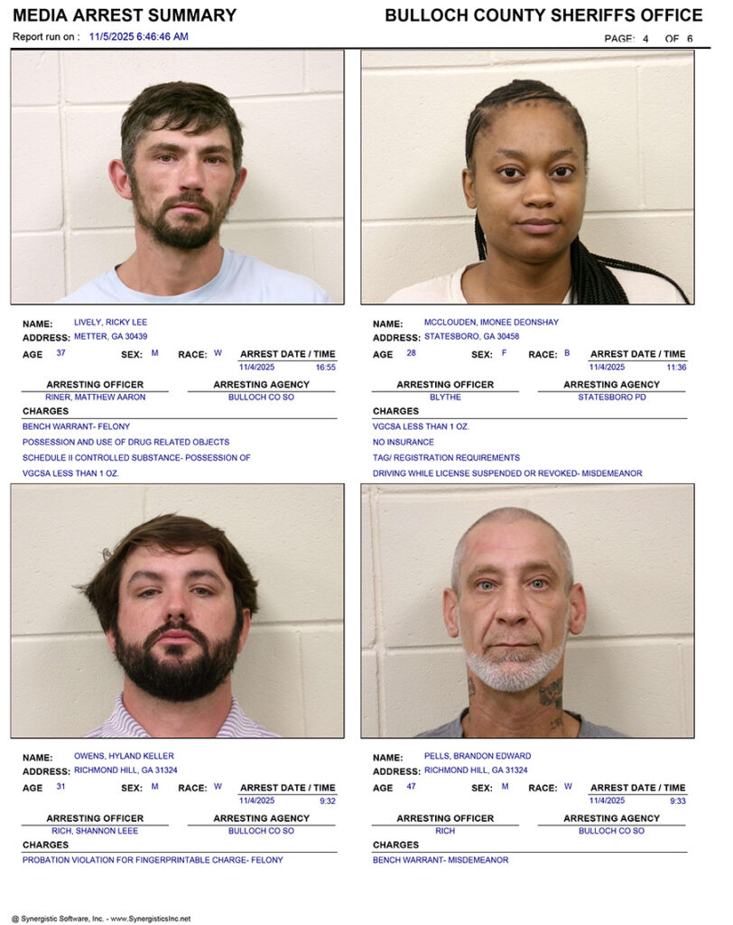 These records are matters of public information provided by the Bulloch County Sheriff’s Office. Booking reports are details of arrests only. All persons below are considered to be innocent unless proven otherwise in a court of law.