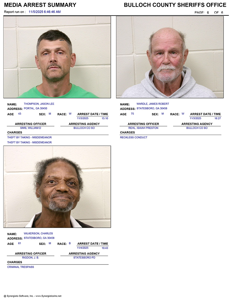 These records are matters of public information provided by the Bulloch County Sheriff’s Office. Booking reports are details of arrests only. All persons below are considered to be innocent unless proven otherwise in a court of law.