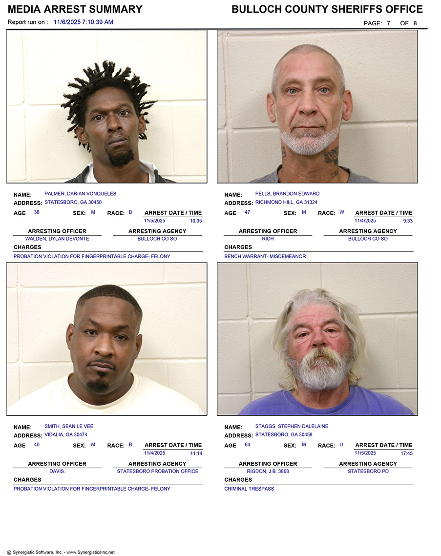 These records are matters of public information provided by the Bulloch County Sheriff’s Office. Booking reports are details of arrests only. All persons below are considered to be innocent unless proven otherwise in a court of law.