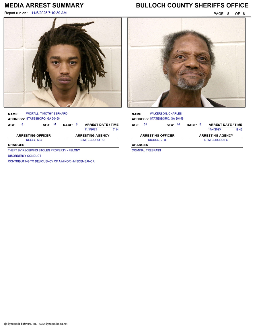 These records are matters of public information provided by the Bulloch County Sheriff’s Office. Booking reports are details of arrests only. All persons below are considered to be innocent unless proven otherwise in a court of law.