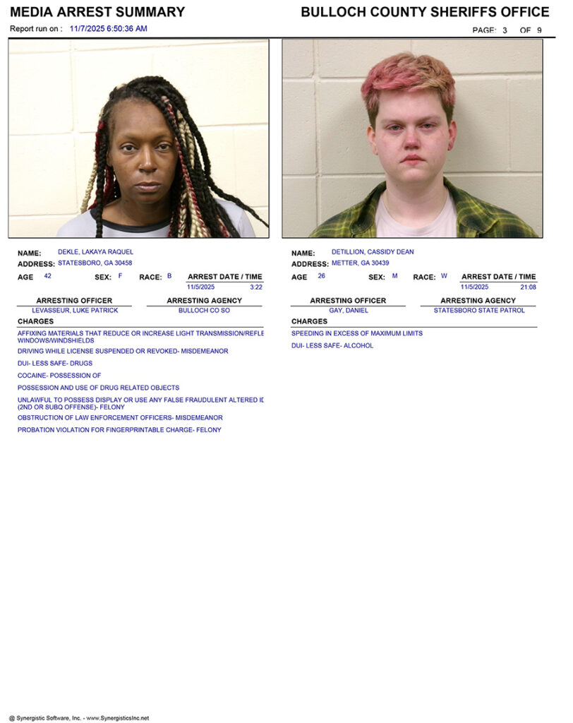 These records are matters of public information provided by the Bulloch County Sheriff’s Office. Booking reports are details of arrests only. All persons below are considered to be innocent unless proven otherwise in a court of law.
