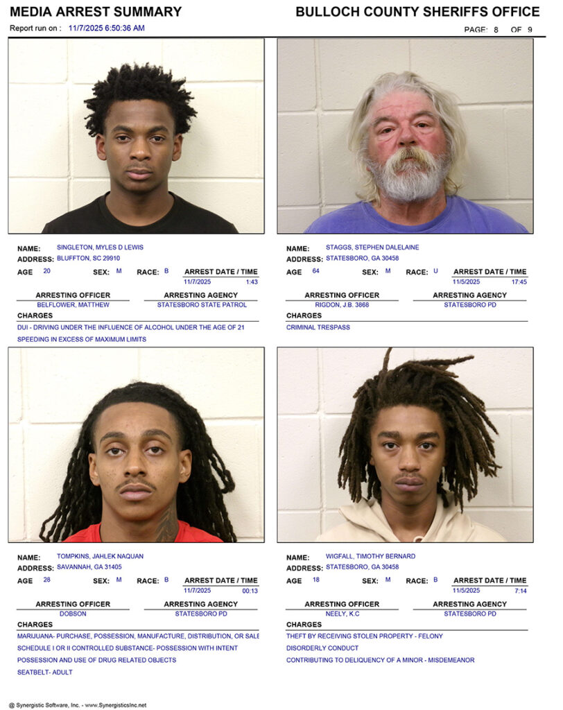 These records are matters of public information provided by the Bulloch County Sheriff’s Office. Booking reports are details of arrests only. All persons below are considered to be innocent unless proven otherwise in a court of law.
