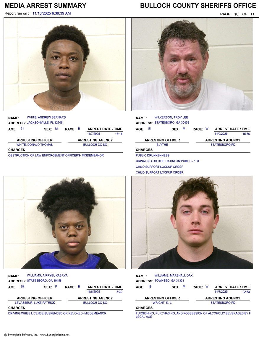 These records are matters of public information provided by the Bulloch County Sheriff’s Office. Booking reports are details of arrests only. All persons below are considered to be innocent unless proven otherwise in a court of law.