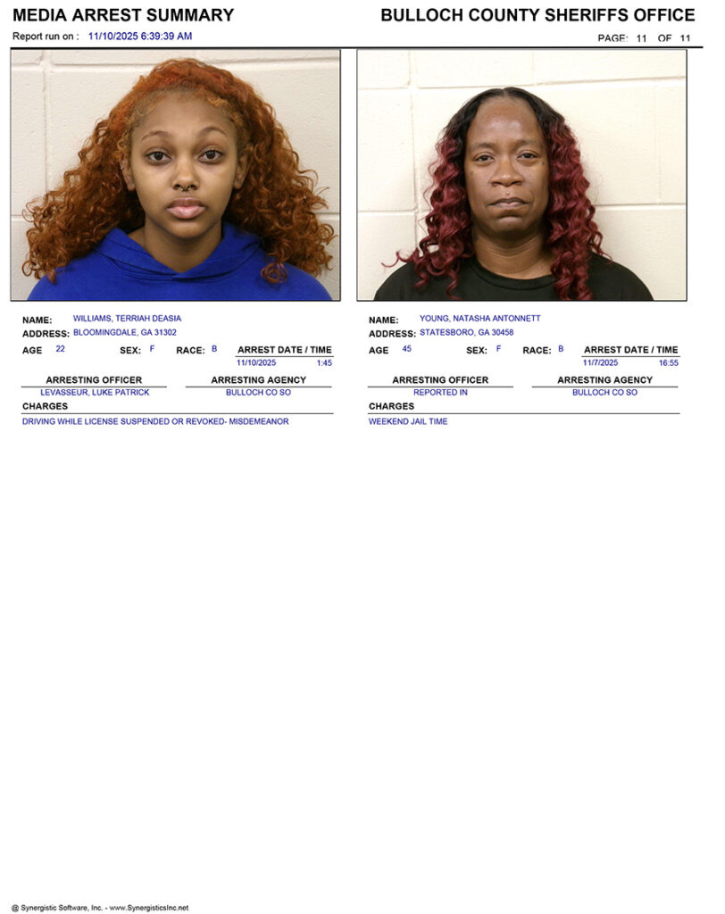 These records are matters of public information provided by the Bulloch County Sheriff’s Office. Booking reports are details of arrests only. All persons below are considered to be innocent unless proven otherwise in a court of law.