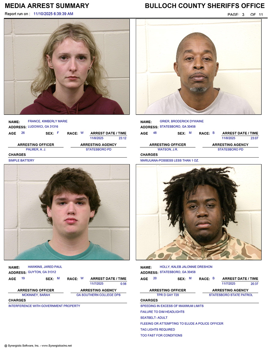 These records are matters of public information provided by the Bulloch County Sheriff’s Office. Booking reports are details of arrests only. All persons below are considered to be innocent unless proven otherwise in a court of law.
